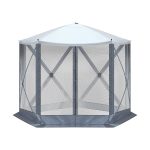 Y our family will have a wonderful time with this 10′ x 10′ Outdoor pop-up camping canopy. With a durable, hard canopy and thick, sturdy posts, this canopy is truly the ultimate in practicality and convenience. It is lightweight and portable and comes with a carrying bag so that you can easily bring the convenient Pop-up gazebo anywhere as a quick, sun-coverage solution. 5 tight-weave mesh sidewalls could protect you from mosquitoes and other flying insects, and the top canopy also wear PA coating, which is UV-resistant and waterproof. The Hub design frame makes it assembly fast and be easy to set up in about 60 seconds. The pre-drilled holes on the bottom of sidewalls allow you to anchor it for better stability. Set it up on your lawn or on your patio, or take it during camping, and get ready to enjoy delightful outdoor life!